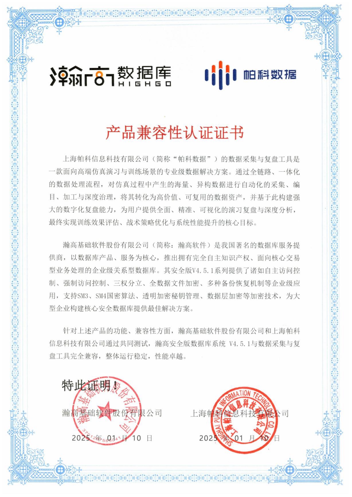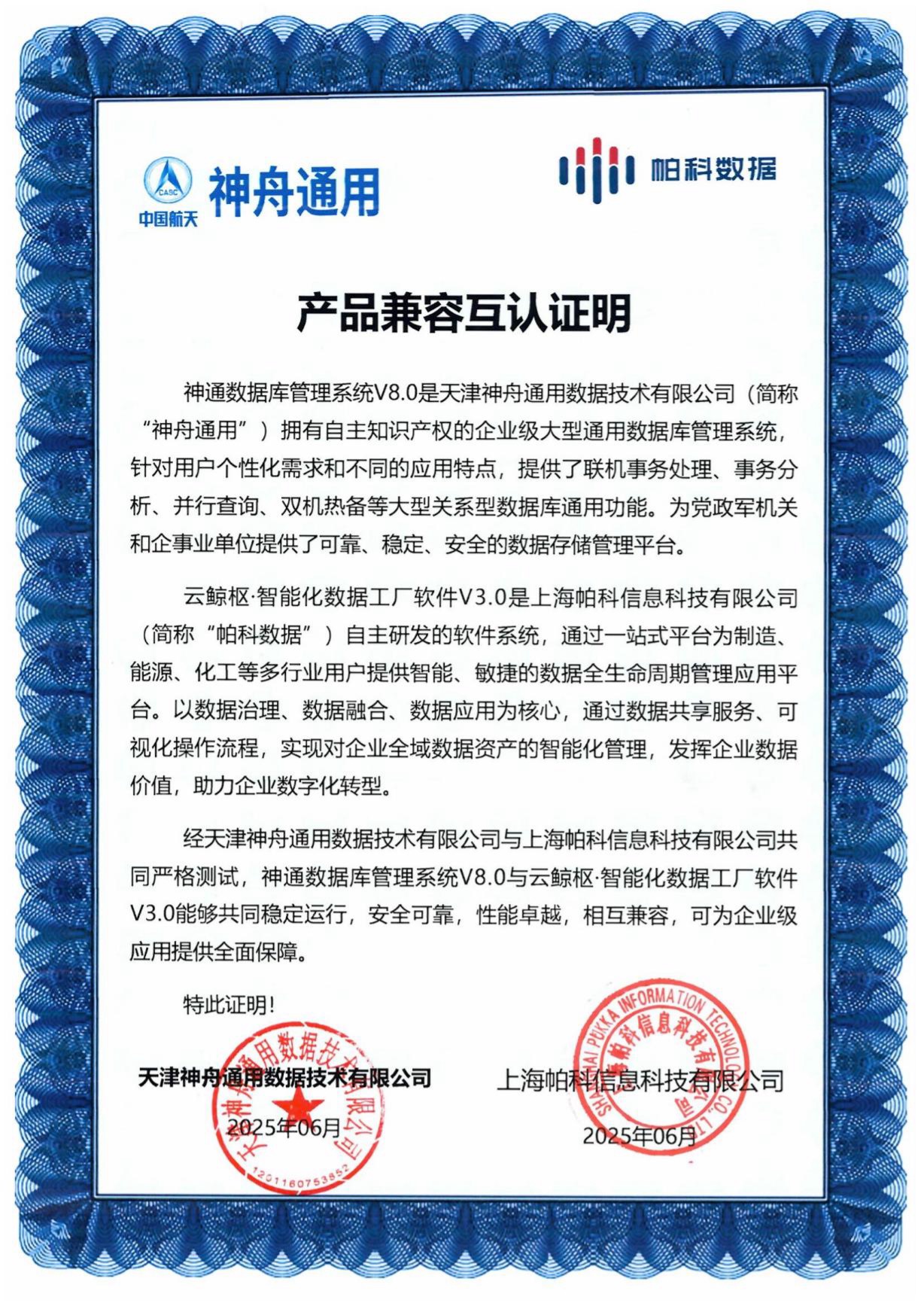 在此次持续迭代的认证工作中,帕科数据的数据采集与复盘工具在与瀚高数据库V4.5.1的兼容性测试里,再次展现出卓越的适配能力,顺利完成新一轮兼容性测试,更新了《产品兼容性认证证书》。同时,帕科数据云鲸枢・智能化数据工厂软件V3.0也与神通数据库管理系统V8.0完成了适配升级工作,再次获颁更新后的《产品兼容性认证证书》。经多轮测试结果均表明,双方产品在功能、性能、兼容性及稳定性等维度持续保持优异表现,能够持续为航天、军工等行业用户,提供安全可靠、高效协同的数据管理解决方案。
